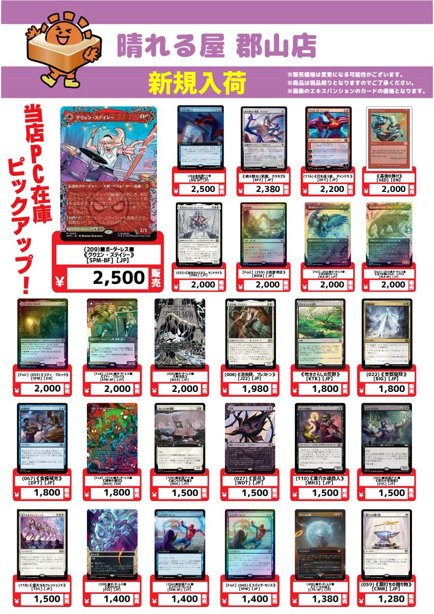 【店舗情報】 いらっしゃいませ☀️ 晴れる屋郡山店オープンしました‼️ ✨注目イベント✨ 1⃣《量子の謎かけ屋》争奪パイオニア 2⃣晴れる屋スペシャルカップ レガシー 3⃣KCG 詳細はこちら🔽 🎯注目商品🎯 『マーベル スパイダーマン』各種商品 ご来店お待ちしております🙏