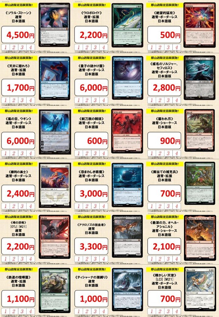 【買取情報】 『晴れる屋 郡山店』限定買取、更新しました‼️ 🎯注目の買取価格🎯 《天井に隠れろ》¥1,700 《嵐の目、ウギン》¥6,000 《剃刀族の棘頭》¥600 《鉄道の喧嘩屋》¥1,100 《輝かしい天使》¥700 スリーブ抜きやソートは不要です👌 皆さまお気軽にお持ち込みください🙇