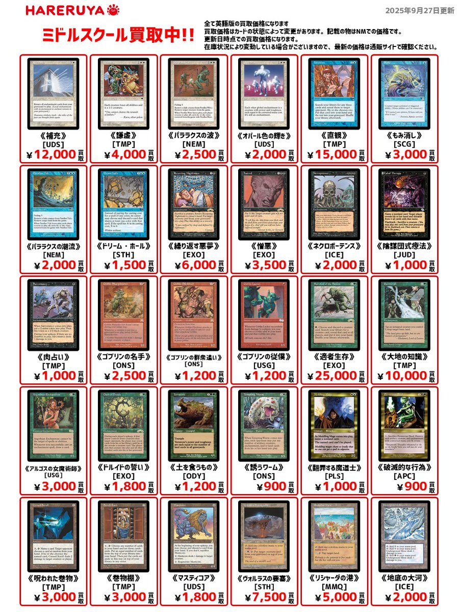 【買取情報】 🌳ミドルスクール買取募集中🌳 🔽英語版参考価格はコチラ 《適者生存》[EXO] ¥25,000 《直観》[TMP] ¥15,000 《繰り返す悪夢》[EXO] ¥6,000 《憎悪》[EXO] ¥3,500 《陰謀団式療法》[JUD] ¥1,000 査定は1枚だけでも🆗です👌 ご来店お待ちしております🙇♀️