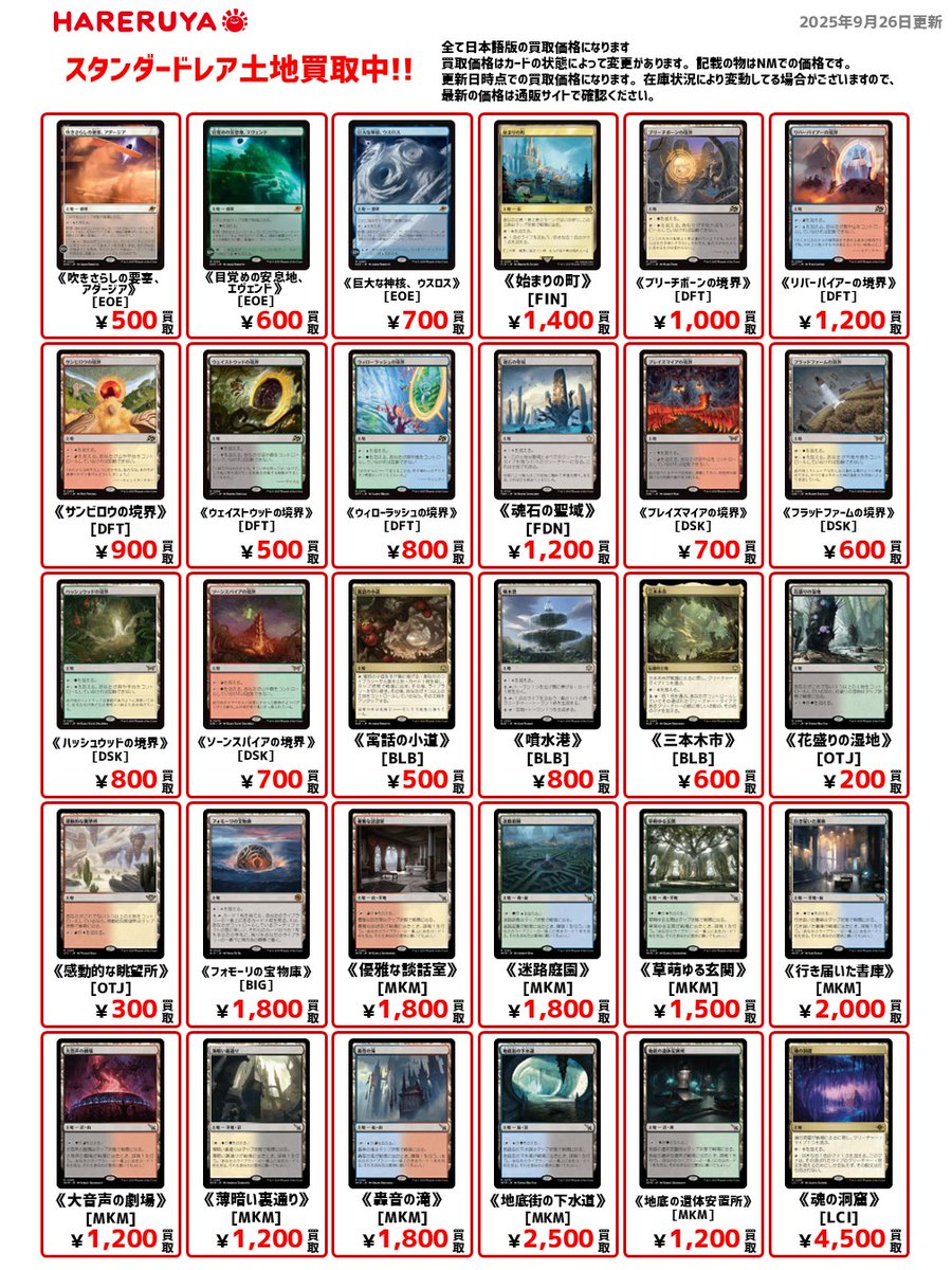 【買取情報】 🏝️スタンダードのレア土地買取募集中🏝️ 日本語・通常版の参考価格はこちら🔽 《魂の洞窟》[LCI] ¥4,500 《地底街の下水道》[MKM] ¥2,500 《始まりの町》[FIN] ¥1,400 《噴水港》[BLB] ¥800 《寓話の小道》[BLB] ¥500 買取は1⃣枚からでもOKです👍 皆さんのご来店お待ちしております🙇