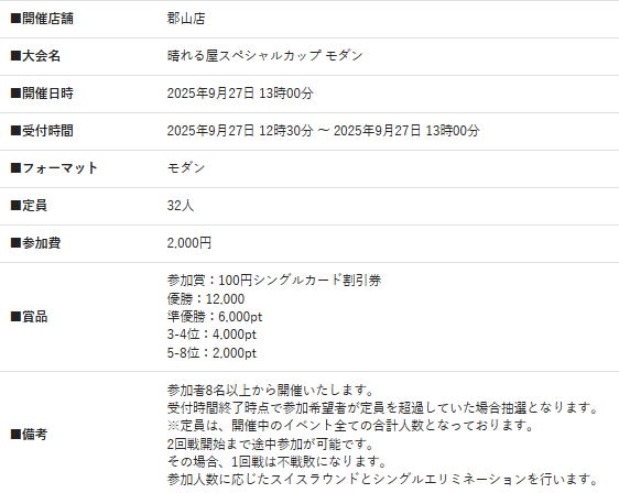 【#晴れ郡イベント】 明日開催注目イベントは、、、 ✅9/6(土)13:00~晴れる屋スペシャルカップモダン 🏆優勝:晴れる屋ポイント12,000pt 優勝でゲットした沢山のポイントで、欲しかったカードやサプライを揃えちゃおう👍 皆さんのご参加お待ちしております‼️
