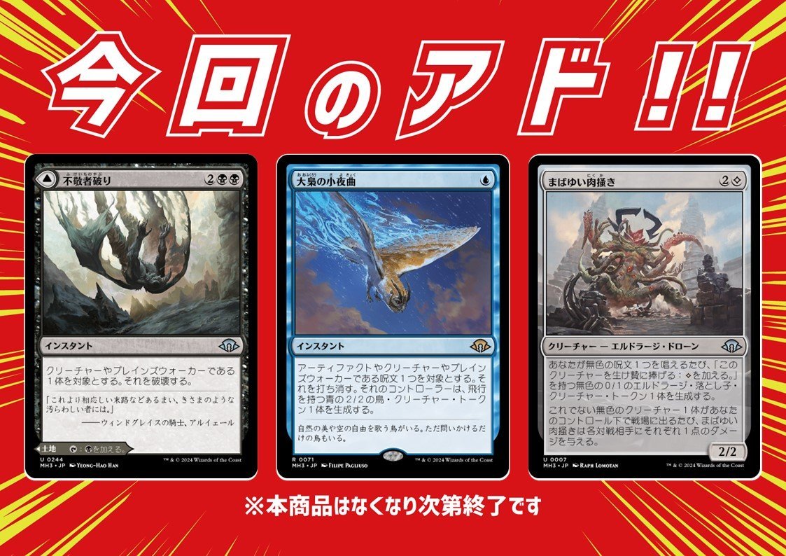 【#晴れ郡商品情報】 「アドクレーン」新ロットで好評稼働中‼️ ✨今回のアドはこちら✨ 《大梟の小夜曲》 《不敬者破り》 《まばゆい肉掻き》 今回のテーマ:モダンホライゾンⅢ🌅 晴れる屋郡山店自販機コーナー横にございます💪 ご来店の際にはぜひ遊んでくださいね😁