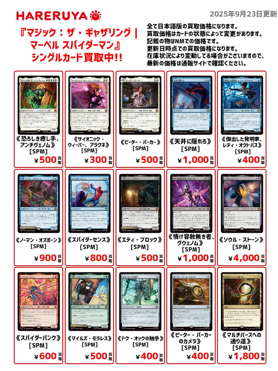 【買取情報】 最新セット『マーベル スパイダーマン』買取募集中‼️🕸️ 日本語版買取参考価格はコチラ🔽 《ソウル・ストーン》[SPM] ¥4,000 《マルチバースへの通り道》[SPM] ¥1,800 《天井に隠れろ》[SPM] ¥1,000 《情け容赦無き者、グウェノム》[SPM] ¥1,000 ドシドシお持ち込みください‼️💥