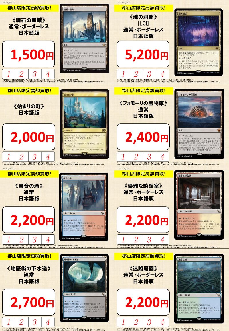 【買取情報】 『晴れる屋 郡山店』限定で買取大募集‼️ 🎯注目のカード🎯 《魂の洞窟》¥5,200 《フォモーリの宝物庫》¥2,400 《轟音の滝》¥2,200 《優雅な談話室》¥2,200 《始まりの町》¥2,000 不要になったカードは『晴れる屋 郡山店』までお気軽にお持ち込みください💪