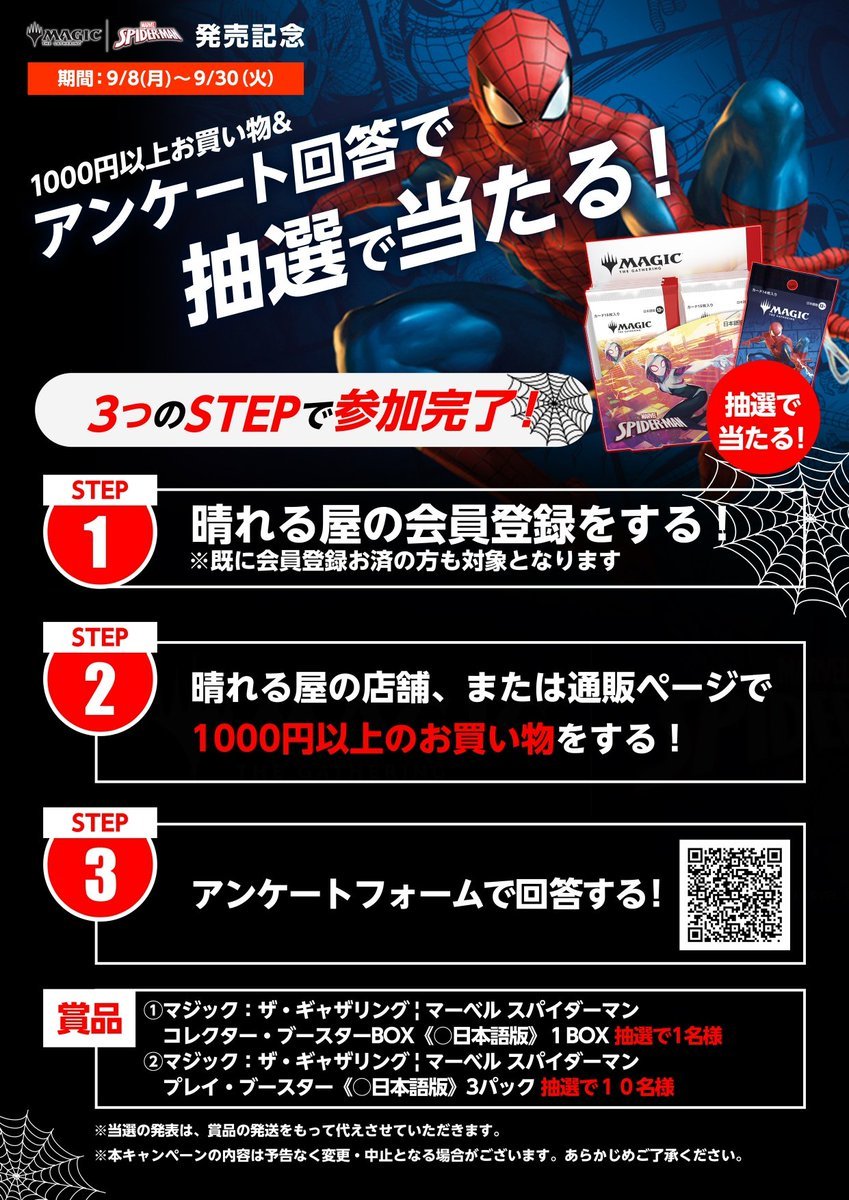 【お知らせ】 『マジック:ザ・ギャザリング | マーベル スパイダーマン』発売記念キャンペーン開催🕷 SPMコレクター・ブースターが当たるかも⁉️ ✅応募条件 1⃣晴れる屋の会員登録 2⃣期間中1000円以上の購入(店頭orオンライン) 3⃣アンケート回答 アンケートはコチラから🔽