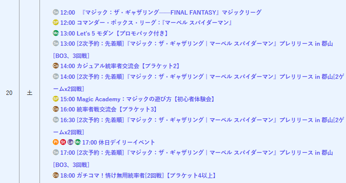 【#今日の晴れ郡】 13時・14時開催 1⃣『マジック:ザ・ギャザリング | マーベル スパイダーマン』プレリリース 2⃣休日デイリーモダン 3⃣統率者戦交流会 スタートしております‼️ 🏆賞品一覧🏆 1⃣プレイ・ブースター×2(完走時) 2⃣2勝以上:プロモパック+ポイント 3⃣勝利or盛り上げ:プロモパック