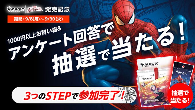 【お知らせ】 『マジック:ザ・ギャザリング | マーベル スパイダーマン』発売記念キャンペーン開催🕷 抽選でコレクター・ブースターが当たるかも⁉️ ✅応募条件 1⃣晴れる屋の会員登録 2⃣1000円以上のお買い物(店頭orオンライン) 3⃣アンケート回答 アンケートはコチラから🔽