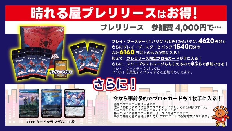 【#晴れ郡イベント】 『マーベル スパイダーマン』プレリリース、2次予約受付中🕷️ 参加するだけで¥2,160のアド🎵 さらに【事前予約】をすると、 1⃣《灯の燼滅》などプロモカード 2⃣『FINAL FANTASY』アートポスター が当たるチャンス‼️🎯 ご予約はこちらから🔽