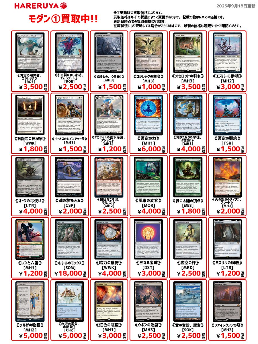 【買取情報】 ⚔️モダン買取募集中⚔️ 参考価格はコチラ🔽 《否定の力》[MH1] ¥6,000 《風景の変容》[MOR] ¥4,000 《記憶への放逐》[MH3] ¥1,000 《出産の儀》[MH3] ¥700 1枚から買取🆗です✨ 郡山でMTGのことなら ✅アティ郡山8F『晴れる屋郡山店』へ‼️💨