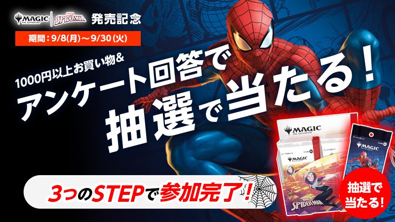 【お知らせ】 『マジック:ザ・ギャザリング | マーベル スパイダーマン』発売記念キャンペーン開催🕷 コレクター・ブースターが当たるチャンス🎵 ✅応募条件 1⃣晴れる屋の会員登録 2⃣期間中1000円以上の購入(店頭orオンライン) 3⃣アンケート回答 アンケートはコチラから🔽