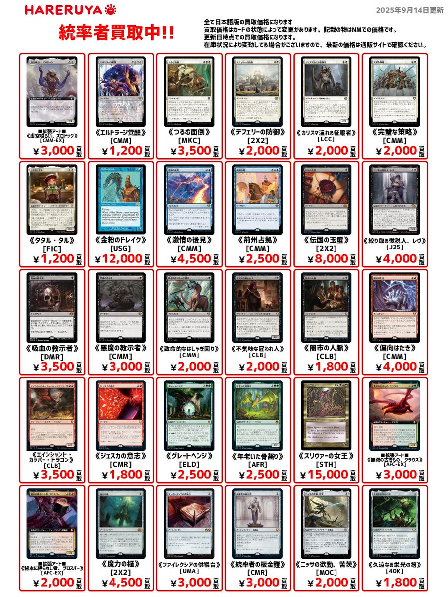 【買取情報】 👑統率者買取募集中👑 日本語版の参考買取価格はコチラ🔽 《スリヴァーの女王》[STH] ¥15,000 《金粉のドレイク》[USG] ¥12,000 《魔力の櫃》[2X2] ¥4,500 《悪魔の教示者》[CMM] ¥3,000 《タタル・タル》[FIC] ¥1,200 1枚からでもご査定承ります✨ 皆さまのご来店お待ちしております🙏