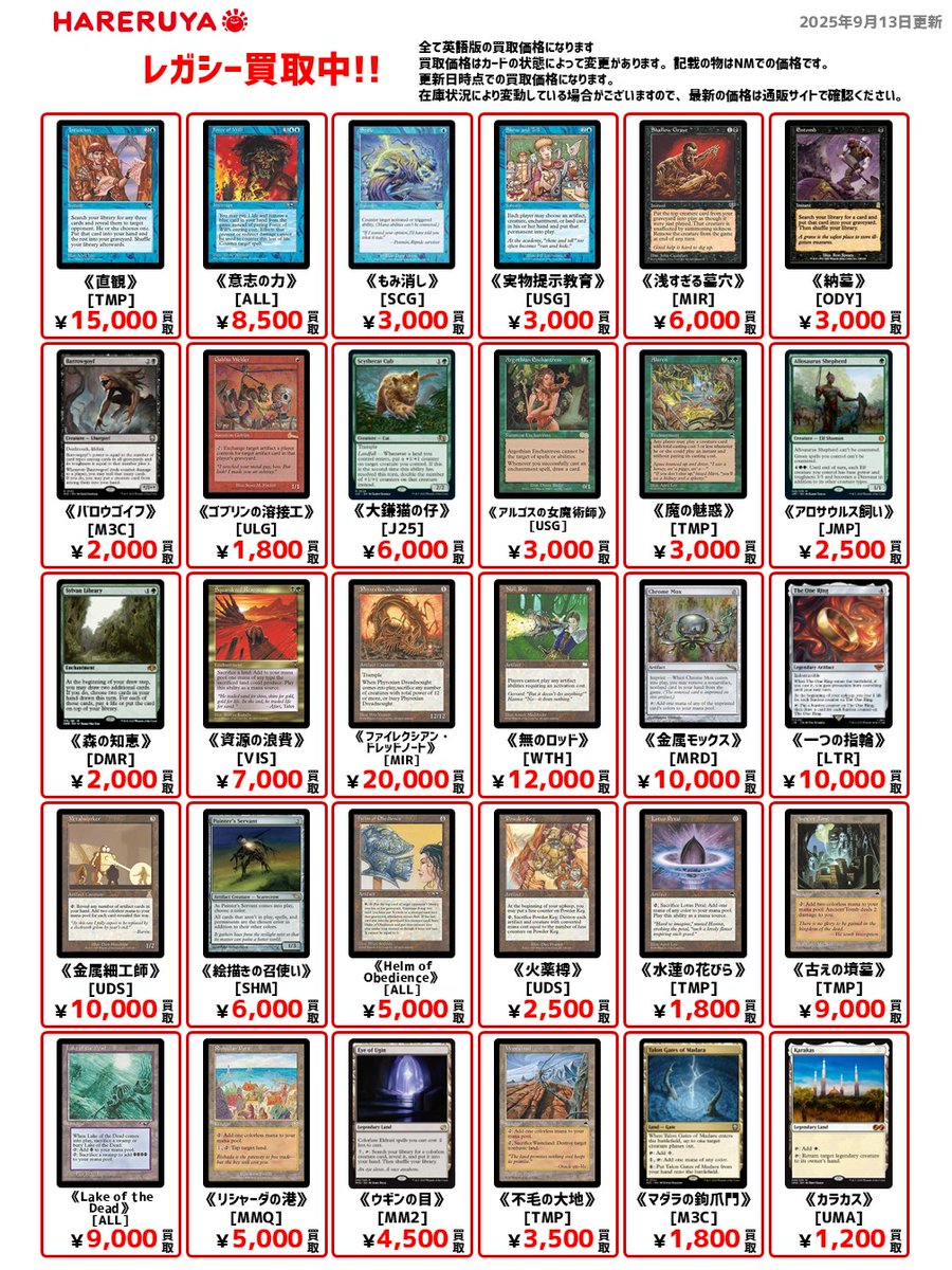 【買取情報】 ✨ミドルスクール買取募集中✨ 🔽英語版参考価格はコチラ 《適者生存》[EXO] ¥25,000 《直観》[TMP] ¥15,000 《補充》[UDS] ¥12,000 《繰り返す悪夢》[EXO] ¥6,000 《パララクスの波》[NEM] ¥2,500 《陰謀団式療法》[JUD] ¥1,000 大量持ち込み大歓迎です‼️ ご来店お待ちしております😆