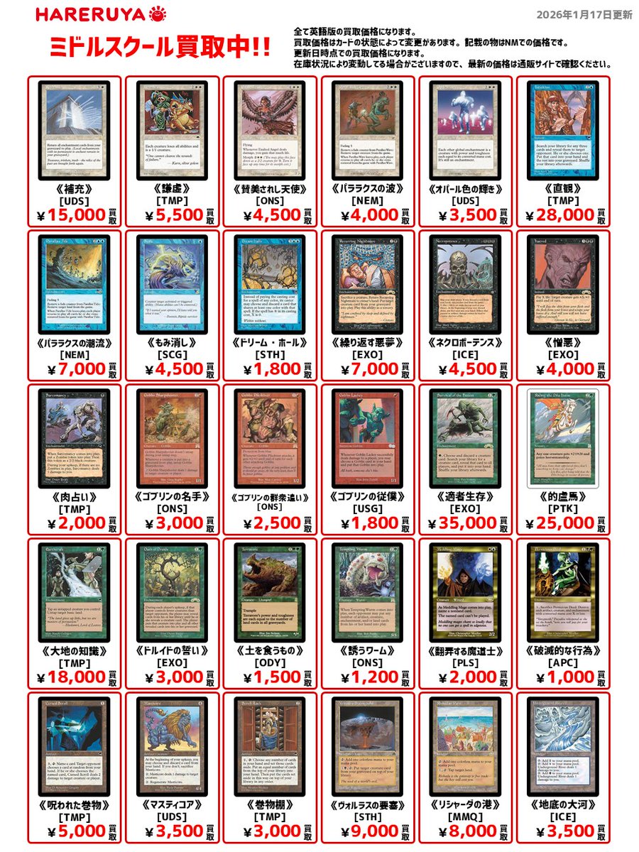 【買取情報】 🌲ミドルスクール買取募集中🌲 英語版の参考価格はコチラ🔽 《リシャーダの港》[MMQ] 8,000円 《パララクスの潮流》[NEM] 7,000円 《謙虚》[TMP] 5,500円 《呪われた巻物》[TMP] 5,000円 1枚でも大量でも大歓迎‼️😆 皆さまのお持ち込みお待ちしております👍