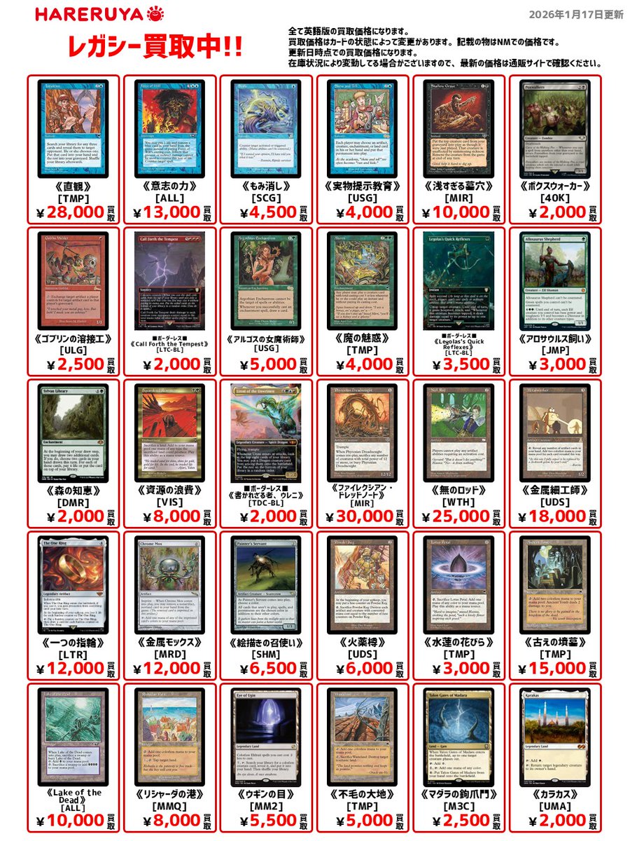 【買取情報】 ✨レガシーの買取募集中✨ 英語版参考価格はコチラ🔽 《意志の力》[ALL] 13,000円 《一つの指輪》[LTR] 12,000円 《金属モックス》[MRD] 12,000円 《浅すぎる墓穴》[MIR] 10,000円 《Lake of the Dead》[ALL] 10,000円 昔遊んでいたカードがタンスの奥で高くなっているかも😎