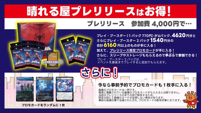 【#晴れ郡イベント】 『マーベル スパイダーマン』プレリリース、2次予約開始しました‼️🥳 ✨✨晴れる屋プレリリースのここがスゴイ✨✨ 1⃣パックだけで参加費超の内容 2⃣キットからは特別仕様のプロモ排出 3⃣今回は予約でさらにプロモをプレゼント ご予約はこちらから‼️🔽 hareruyamtg.com/ja/events/li…