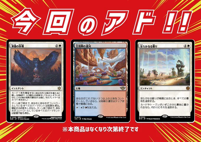 【#晴れ郡商品情報】 🔥「アドクレーン」新ロット追加‼️🔥 今回のアドはこちら🔽 《尖塔断の運河》🟦🟥 《薄暮の休戦》🦉 《安らかなる眠り》🪦 1回1⃣0⃣0⃣円でレッツチャレンジ🎵 ブースターパックやレアカードもぎっしり入れました✨ 晴れる屋郡山店にお越しの際はぜひチャレンジを‼️💪