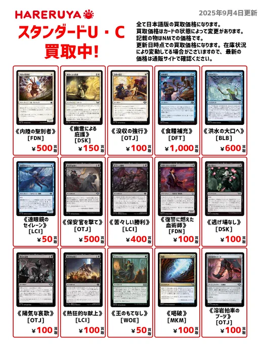 【買取情報】 スタンダードUC・C買取募集中です‼️ 日本語版参考価格はこちら🔽 《食糧補充》[DFT] ¥1,000 《保安官を撃て》[OTJ] ¥500🆙 《没収の強行》[OTJ] ¥100🆕 《復讐に燃えた血術師》[FDN] ¥100🆕 1枚からでも大歓迎‼️😆 皆さまのご来店・お持ち込み、お待ちしております🙇♀️