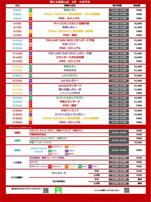 【イベント情報】 ⚠️9月のイベントが一部変更となりました⚠️ ✅変更箇所 1⃣9/7(日) スペシャルカップレガシー⏩争奪レガシー 2⃣9/27(土) 争奪パウパー⏩争奪スタンダード 急な変更となり申し訳ございません💦 ご理解の程よろしくお願いいたします🙇
