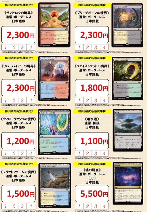 【買取情報】 『晴れる屋 郡山店』限定で買取強化中です‼️ 🎯注目のカード🎯 《リバーパイアーの境界》¥2,300 《ブリーチボーンの境界》¥2,300 《フラッドファームの境界》¥1,500 《噴水港》¥1,100 《魂の洞窟》¥5,500 買取はアティ郡山8F『晴れる屋郡山店』までお持ち込みください😆