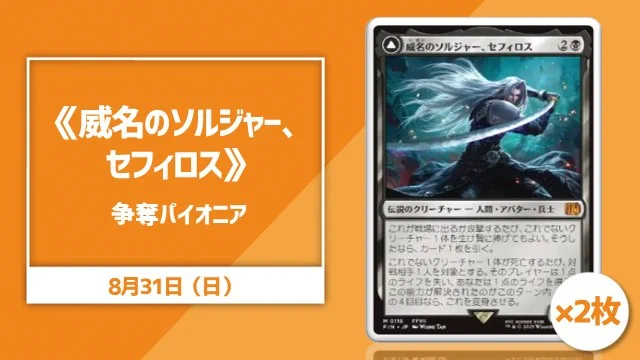 【#晴れ郡イベント】 今週末開催注目イベントは、、、 ✅8/31(日)13:00~《威名のソルジャー、セフィロス》争奪パイオニア hareruyamtg.com/ja/events/46… スタンダードからレガシーまで採用実績のある1枚🪽 沢山ライフをドレインして勝利を目指そう😈 ご参加お待ちしております🙇♀️
