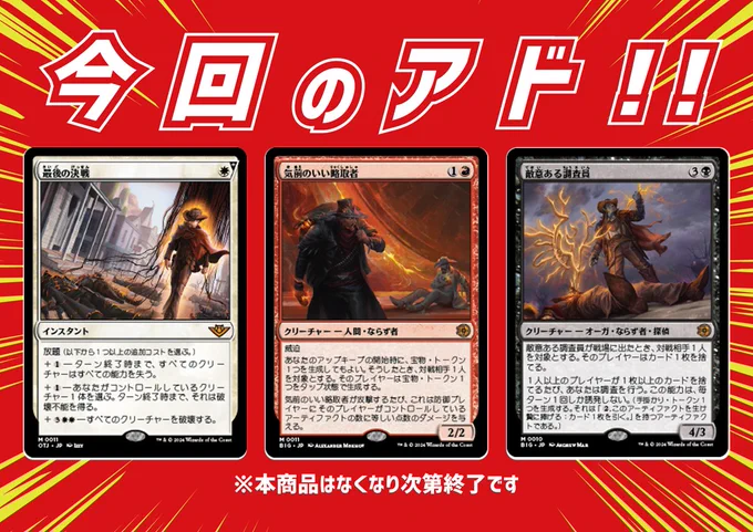 【#晴れ郡商品情報】 お待たせいたしました💨💦 「アドクレーン」新ロット追加です‼️ 今回のアドはこちら🔽 《気前のいい略取者》💰 《最後の決戦》🔫 《敵意ある調査員》😎 パックやレア詰め合わせも盛り盛りです💪 1回1⃣0⃣0⃣円でレッツチャレンジ🎵 ご来店の際は、ぜひ覗いてみてくださいね👀