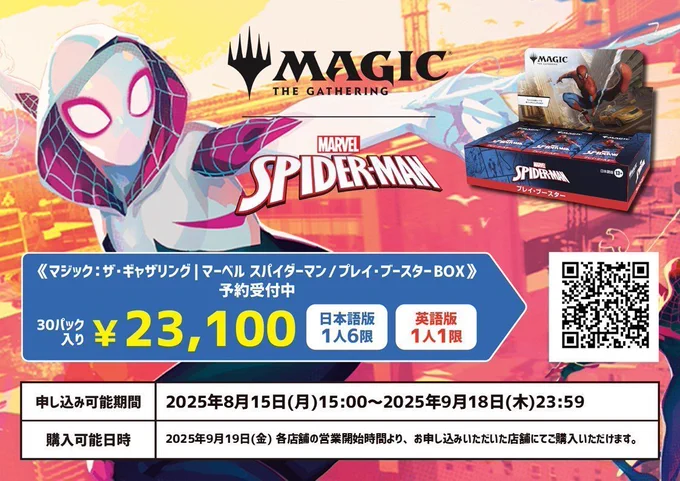 【商品情報】 『マジック:ザ・ギャザリング | マーベル スパイダーマン』プレイブースターBOX予約受付中‼️ 🎉9/19(金)先行販売開始🎉 親愛なる隣人、スパイダーマンがMTGに参戦✨ 発売まで1ヵ月を切りました👏 ご予約はQRコードor下記リンクから🔽 docs.google.com/forms/d/1UpUox…