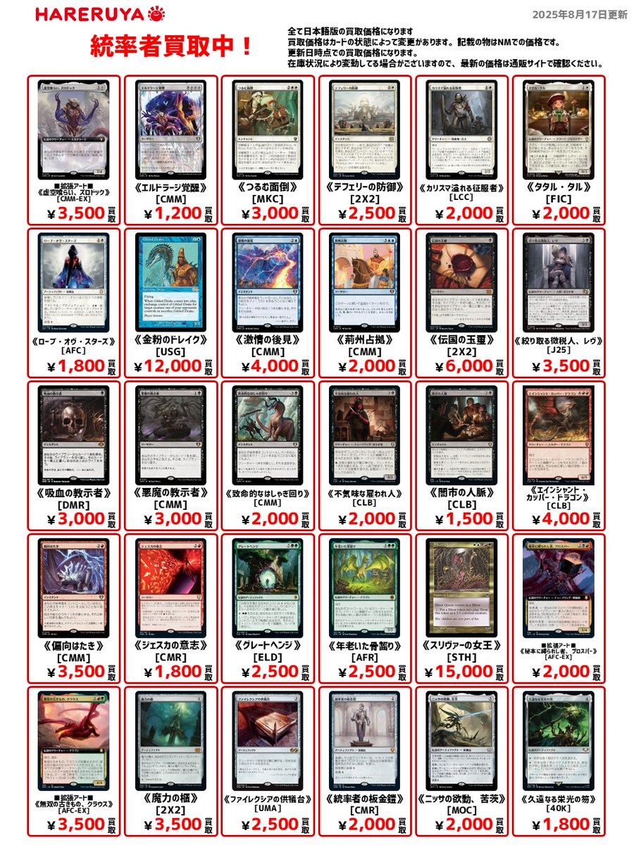 買取情報】 👑統率者買取募集中👑 日本語版の参考価格はコチラ🔽 《スリヴァーの女王》[STH] ¥15,000 《金粉のドレイク》[USG] ¥12,000 《つるむ面倒》[MKC] ¥3,000 《ジェスカの意志》[CMR] ¥1,800 買取キャンペーンは本日まで💦 ✅アティ郡山8F『晴れる屋郡山店』 へ営業時間中にお越しください‼️