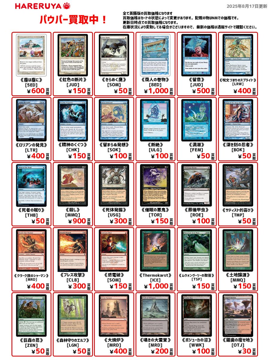 【買取情報】 🤯パウパーフォーマット買取募集中‼️🤯 🔽英語版の参考価格はコチラ🔽 《Thermokarst》[ICE] ¥1,000 《殺し》[MMQ] ¥900 《ロリアンの発見》[LTR] ¥400🆙 《感電破》[SOM] ¥150🆙 買取キャンペーンは本日最終日💦 ✅アティ郡山8F『晴れる屋郡山店』 まで急ぎお越しください‼️💨