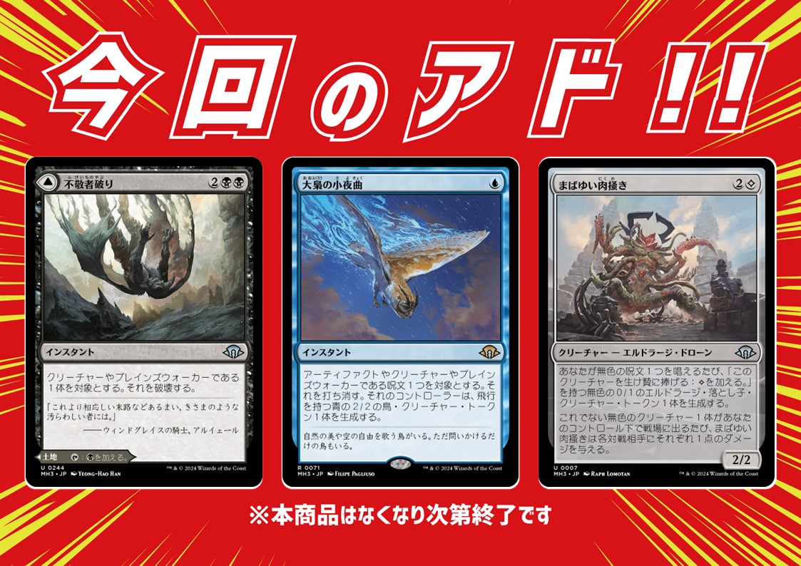 【#晴れ郡商品情報】 「アドクレーン」新ロット追加しました‼️🔥 新年初のアドはこちら🔽 《大梟の小夜曲》 《不敬者破り》 《まばゆい肉掻き》 今回のテーマ:モダンホライゾンⅢ🌅 晴れる屋郡山店自販機コーナー横にて稼働中💪 ご来店の際にはぜひ遊んでくださいね🎵