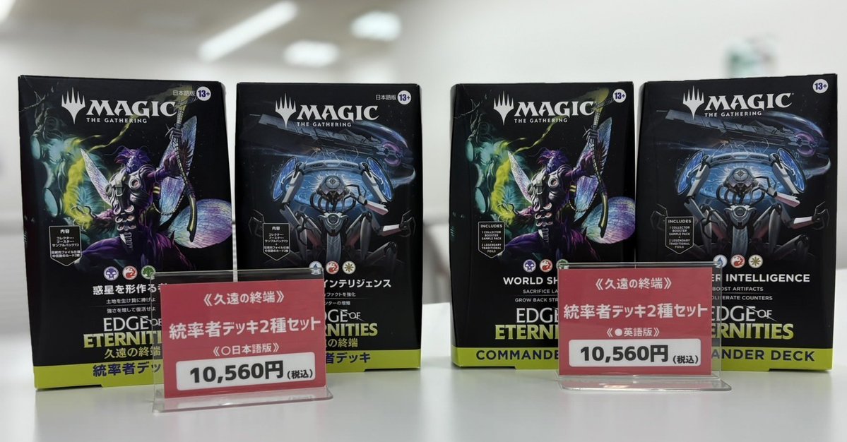 【#晴れ郡商品情報】 最新セット『久遠の終端』統率者、好評販売中‼️ 統率者デッキセット:¥10,560 1⃣カウンターインテリジェンス🤖 2⃣惑星を形作る者🦋 ⚠️英語版2種セット販売のみとなります 新規カードも強いですが、再録カードも熱いですね🔥 皆様のご来店お待ちしております👾