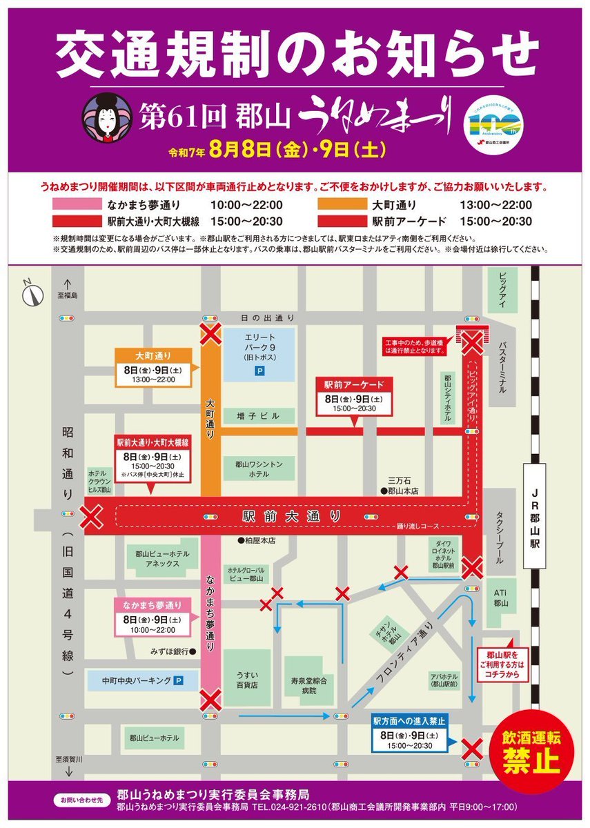 【お知らせ】 本日8/9(土)も郡山駅前は交通規制がございます🚫 うねめまつりのため、大変混雑が予想されますので、 余裕を持ってのご来店をお勧めいたします🚗🚙 ご来店の際は、近くのパーキングエリアがご利用いただけない場合がございますので、お気を付けください‼️