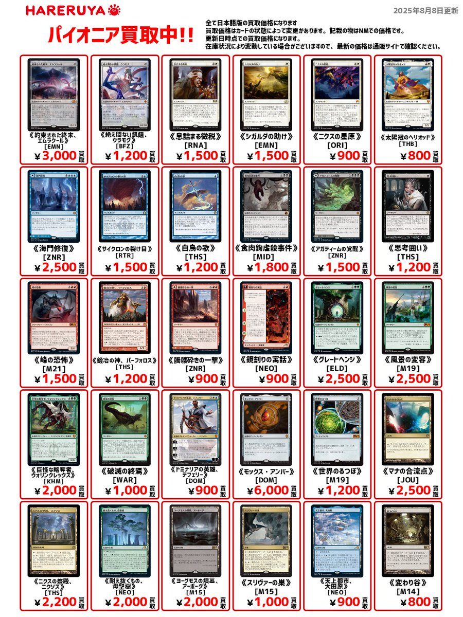 【買取情報】 🔧パイオニア買取募集中🔧 日本語版参考価格はこちら🔽 《モックス・アンバー》[DOM] ¥6,000 《約束された終末、エムラクール》[EMN] ¥3,000 《マナの合流点》[JOU] ¥2,500 《白鳥の歌》[THS] ¥1,200 現在4⃣周年買取キャンペーンも開催中🔥 ご来店お待ちしております🙏