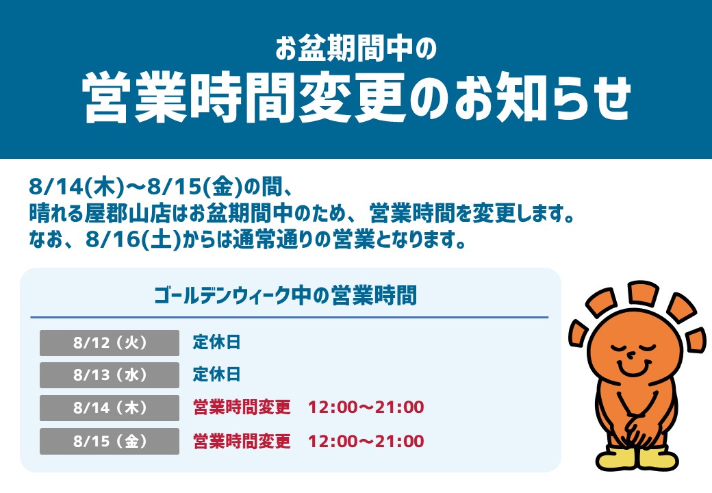 【お知らせ】 8/8(金)、8/9(土)郡山駅前は交通規制がございます🚫 うねめまつりのため、大変混雑が予想されますので、 余裕を持ってのご来店をお勧めいたします🚗🚙 ご来店の際は、パーキングエリアがご利用いただけない場合がございますので、お気を付けください‼️