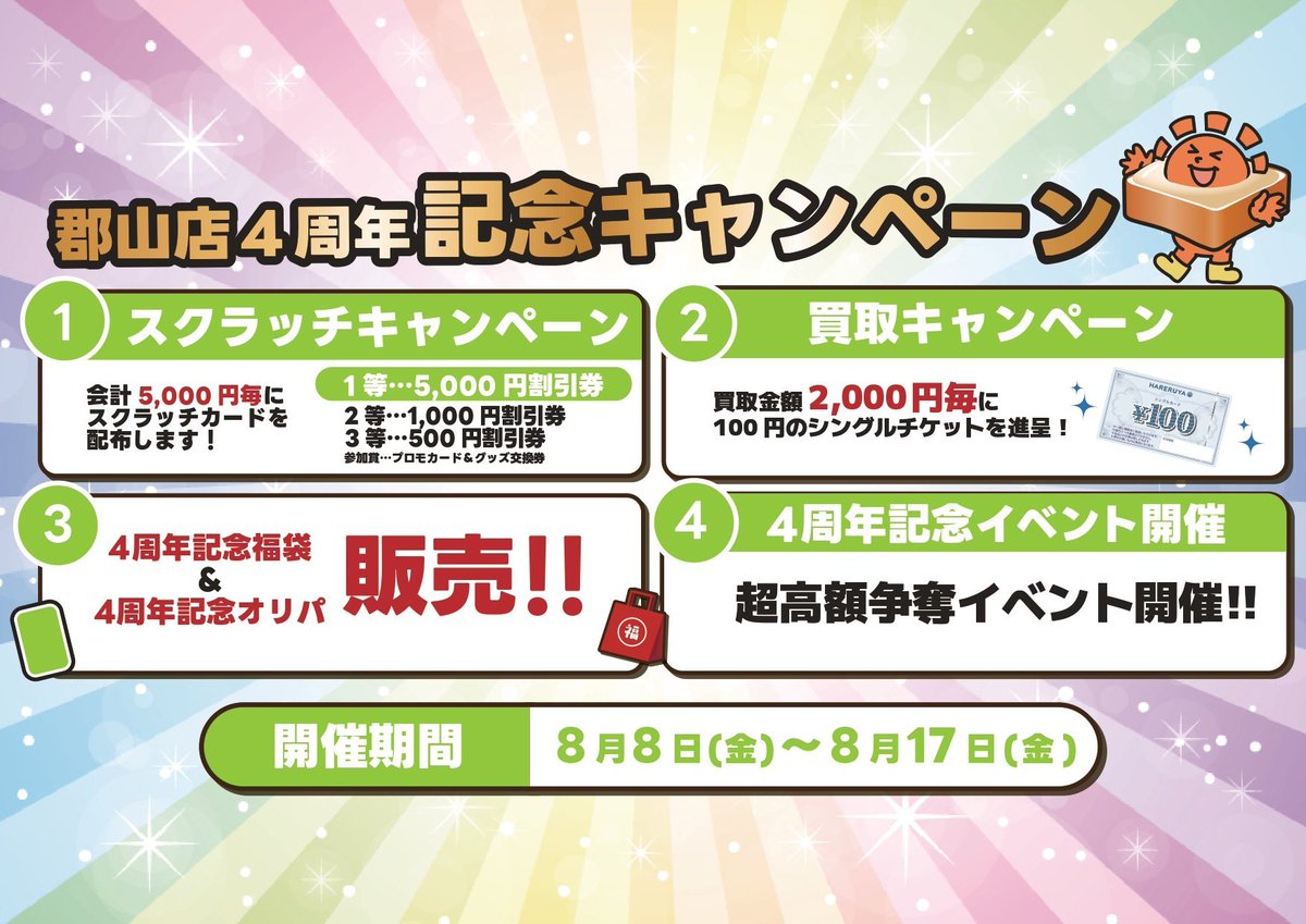 【キャンペーン情報】 🎉#晴れる屋郡山店4周年記念🎉 8/8(金)~8/17(日)の期間でキャンペーンを開催‼️ 「スクラッチ」 「買取チケット」 「福袋&記念オリパ」 「超高額争奪イベント」と目白押し👍 どのキャンペーンも目が離せませんね👀 ご来店お待ちしております🙇♂️