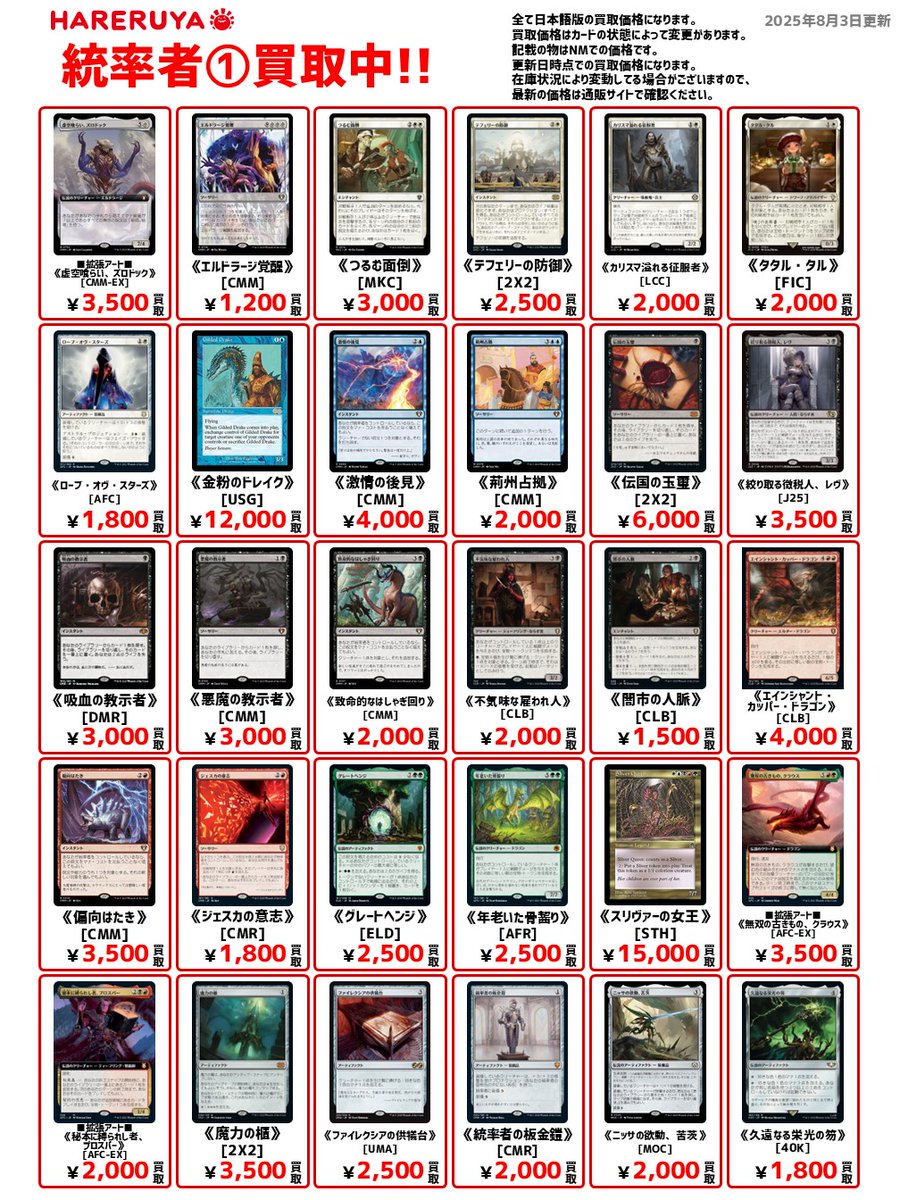 【買取情報】 👑統率者買取募集中👑 日本語版の参考価格はコチラ🔽 《金粉のドレイク》[USG] 12,000円買取 《偏向はたき》[CMM] 3,500円買取 《つるむ面倒》[MKC] 3,000円買取 《巧みな隠蔽》[ONC] 1,000円買取 スリーブやソートは不要です❗️ お気軽にお持ち込みください😆
