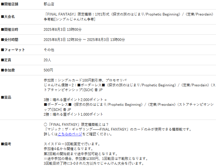 【#晴れ郡イベント】 明日8/3(日)開催の注目イベントは、、、 『FINAL FANTASY』限定構築:1対1形式[シングルじゃんけん争奪] hareruyamtg.com/ja/events/4805… 3勝:晴れる屋ポイント2,000+《探求の旅のはじまり》/《定業》 じゃんけん賞2名:《探求の旅のはじまり》/《定業》 ご参加お待ちしております😊