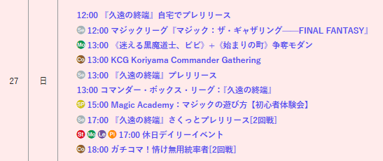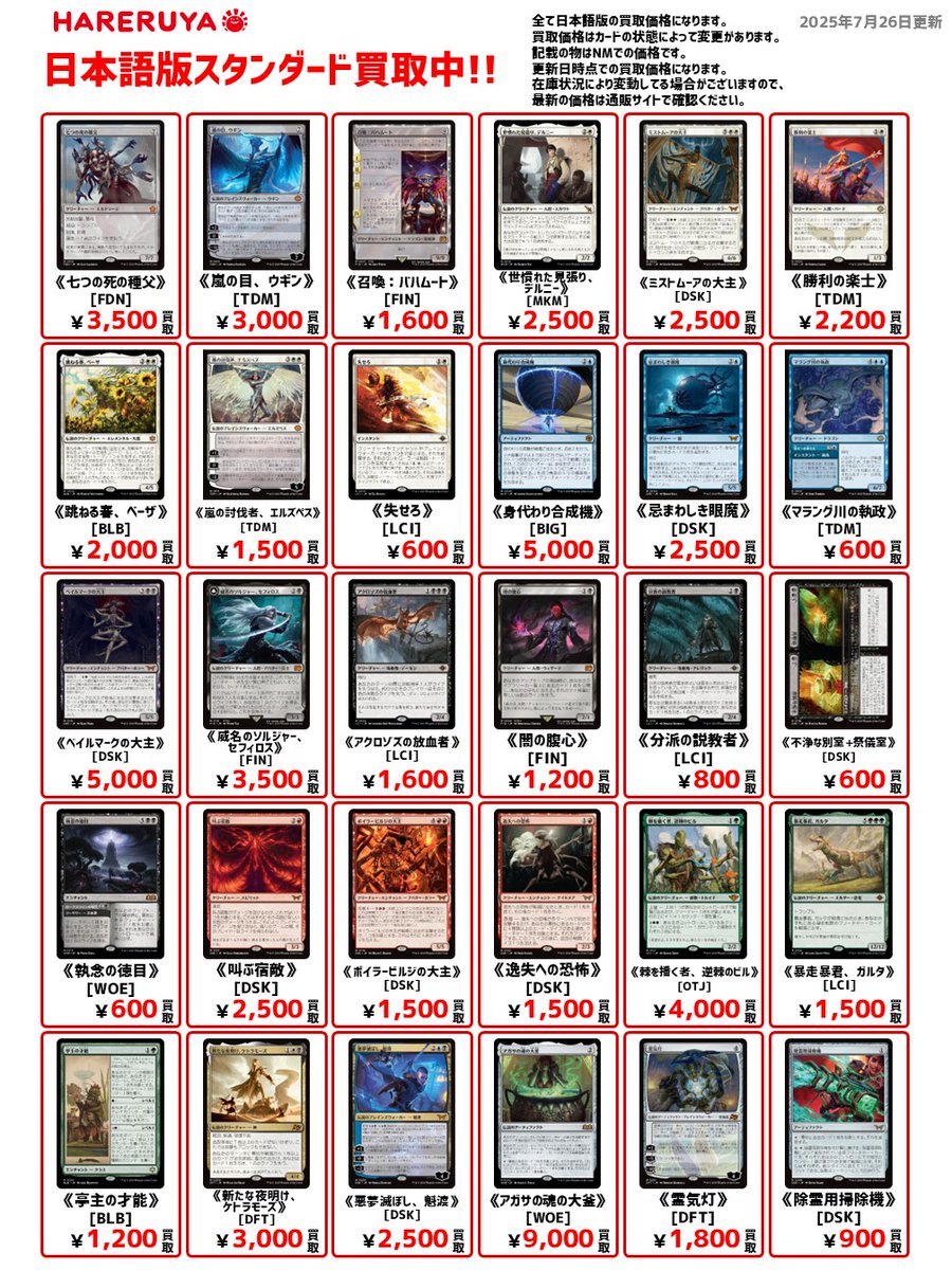 【店舗情報】 本日も晴れる屋郡山店にご来店いただき ありがとうございました‼️ 7/27(日)は12時オープンです☀️ ✨注目イベント✨ 1⃣ 『久遠の終端』プレリリース 2⃣争奪モダン 3⃣KCG Koriyama Commander Gathering 明日もご来店、お待ちしております🙇♂️ 詳細はこちら🔽 hareruyamtg.com/ja/events/