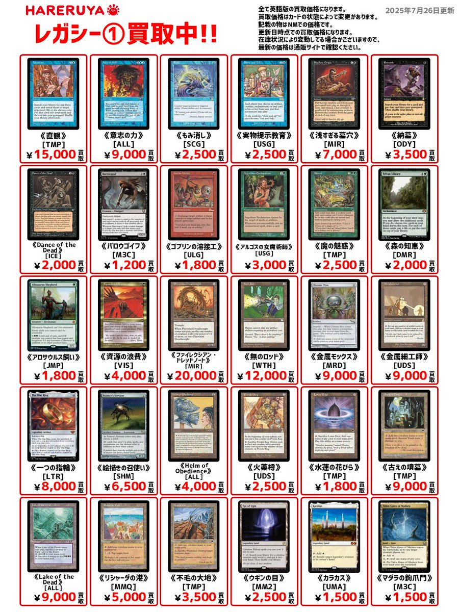 【買取情報】 ✨レガシーの買取募集中✨ 英語版参考価格はコチラ🔽 《直観》[TMP] ¥15,000 《無のロッド》[WTH] ¥12,000 《絵描きの召使い》[SHM] ¥6,500 《騙し討ち》[USG] 1,200円買取 昔遊んでいたカードがタンスの奥で高くなっているかも👀 ご来店お待ちしております‼️