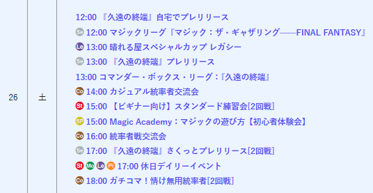 【#晴れ郡イベント】 この後17時からは『久遠の終端』さくっとプレリリース🎉 夕方から2回戦行うプレリリースイベント❗️ 時間がないけどプレリリースに参加したい方にオススメです👍 合計で『久遠の終端』のプレイ・ブースターが2パックついてくるのも嬉しい🤩 参加賞にストレージやスリーブも✌️