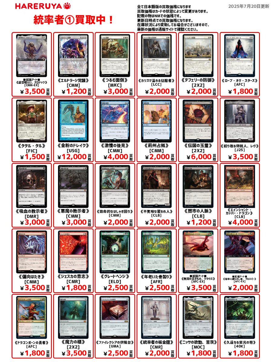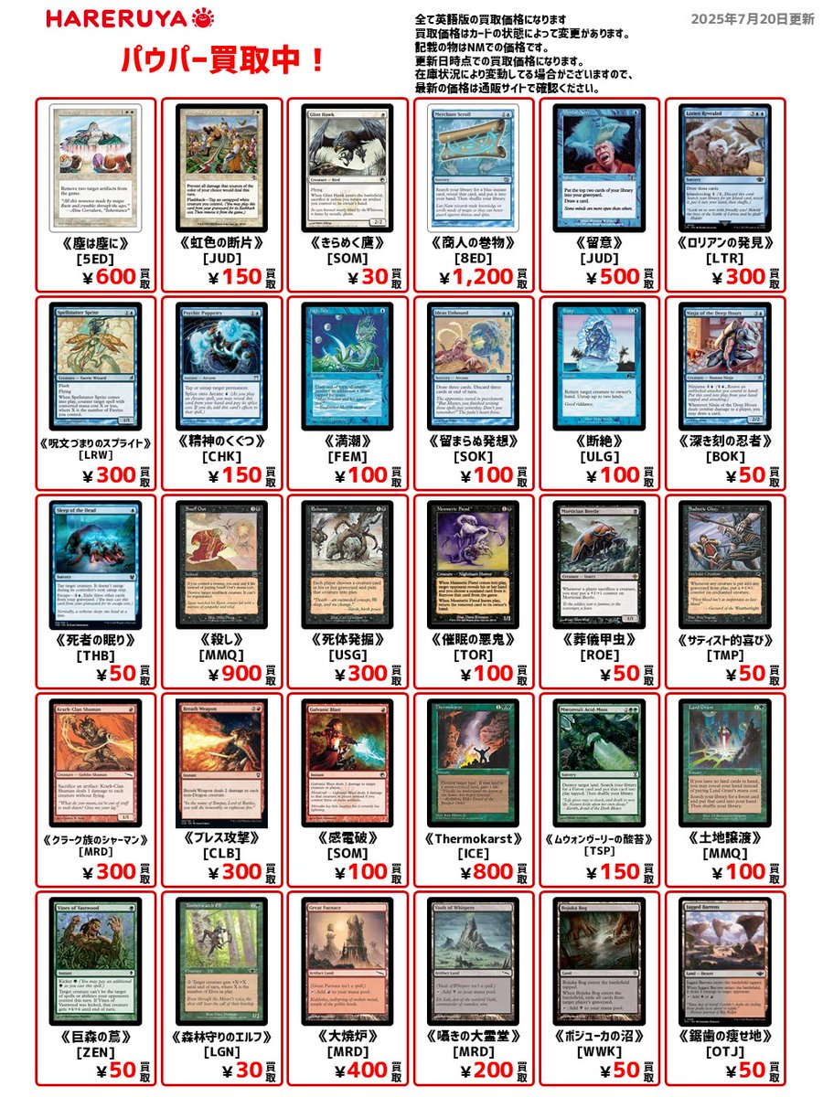 【買取情報】 MTGのカードを売るなら晴れる屋にお任せ‼ お値段がつかないカードも、 各レアリティに応じて最低保証の金額で 買い取らせていただきます✨ まとめ売りもモチロンOK👌 お持ち込みお待ちしております🙏 各種買取価格はこちらから🔽 hareruyamtg.com/ja/purchase/