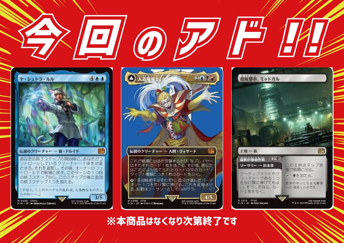 【#晴れ郡商品情報】 「アドクレーン」新ロット追加‼️ 今回のアドはこちら🔽 《人造魔導士、ケフカ》🤡 《ヤ・シュトラ・ルル》😸 《魔晄都市、ミッドガル》🌃 『FINAL FANTASY』Ver.第4弾です✨ 晴れる屋郡山店へご来店の際は、ぜひチャレンジしてくださいね‼️😆