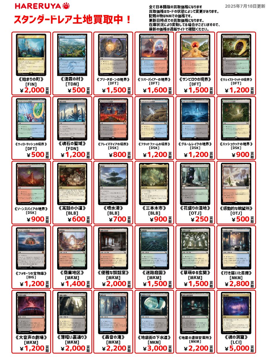 【買取情報】 ✨スタンダードのレア土地買取募集中✨ 🔽日本語・通常版の参考価格 《魂の洞窟》[LCI] ¥5,000 《地底街の下水道》[MKM] ¥3,000 《リバーパイアーの境界》[DFT] ¥1,600🆙 《魂石の聖域》[FDN] 1,200 《湧霧の村》[TDM] ¥500🆙 1枚だけでも🆗です👍 皆様のご来店お待ちしております🙇♀️