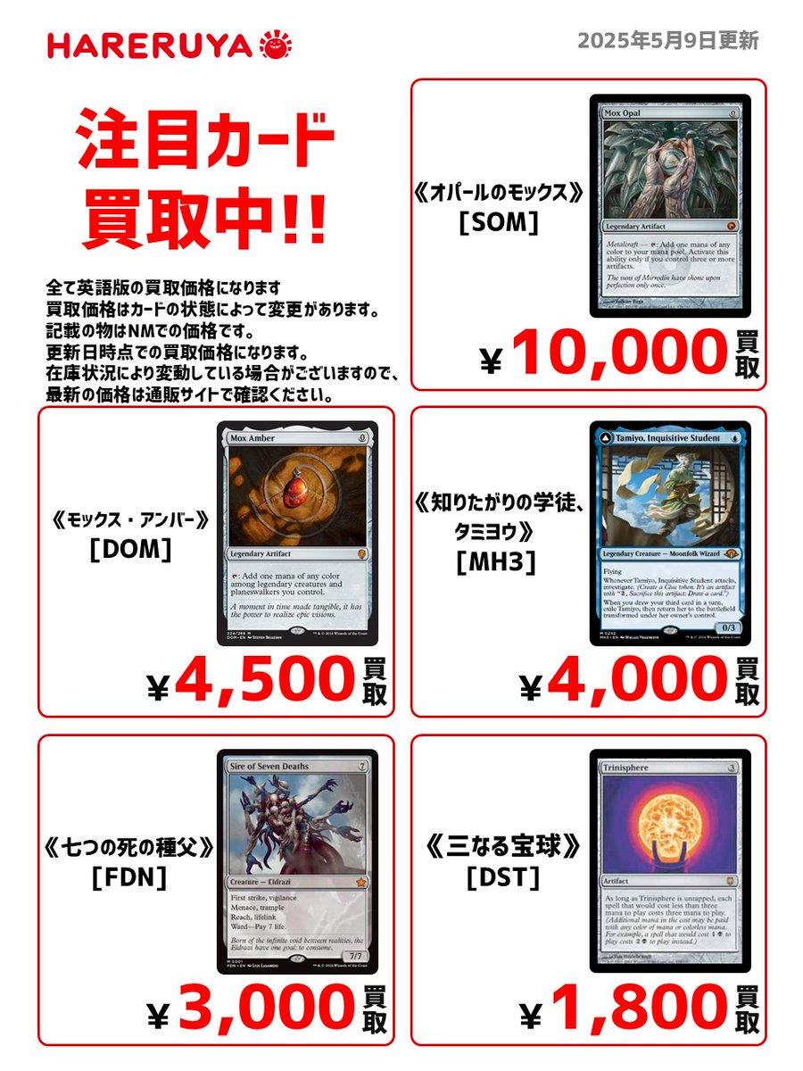 【買取情報】 👀注目カード買取募集中👀 英語版参考価格はこちら🔽 《オパールのモックス》[SOM] ¥10,000 《モックス・アンバー》[DOM] ¥4,500 《知りたがりの学徒、タミヨウ》[MH3] ¥4,000 《七つの死の種父》[FDN] ¥3,000 《三なる宝球》[DST] ¥1,800 ご来店お待ちしております🙇