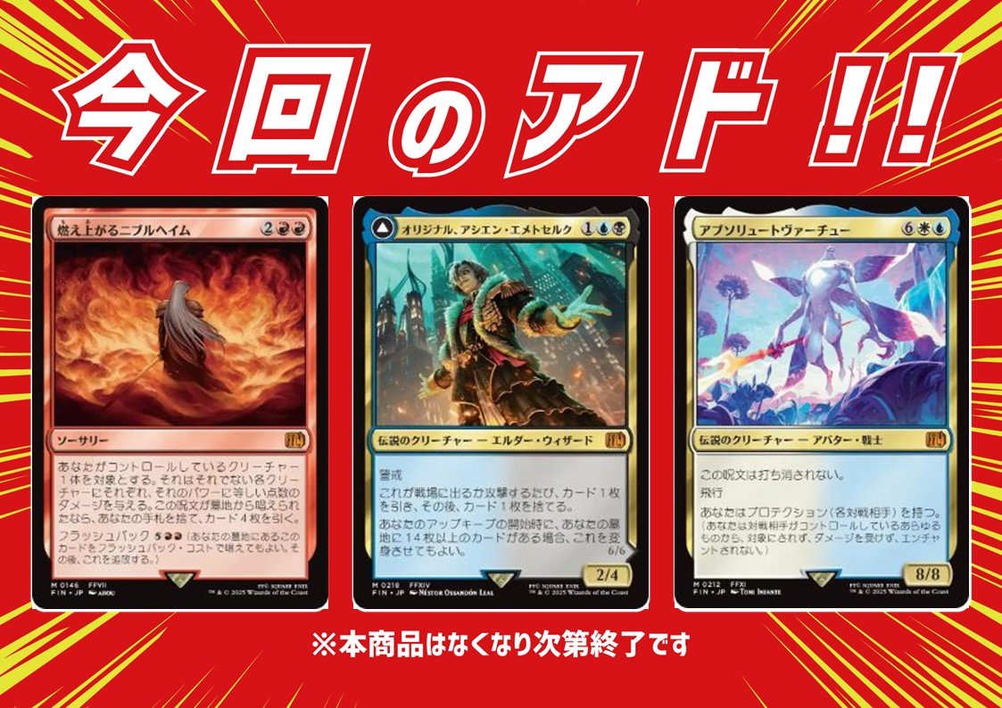 【#晴れ郡商品情報】 「アドクレーン」新ロット追加‼️ 今回のアドはこちら🔽 《オリジナル、アシエン・エメトセルク》🎭 《燃え上がるニブルヘイム》🔥 《アブソリュートヴァーチュー》✨ 『FINAL FANTASY』Ver.第3弾‼️ この週末、ご興味のある方はお見逃しなく~~💨💦