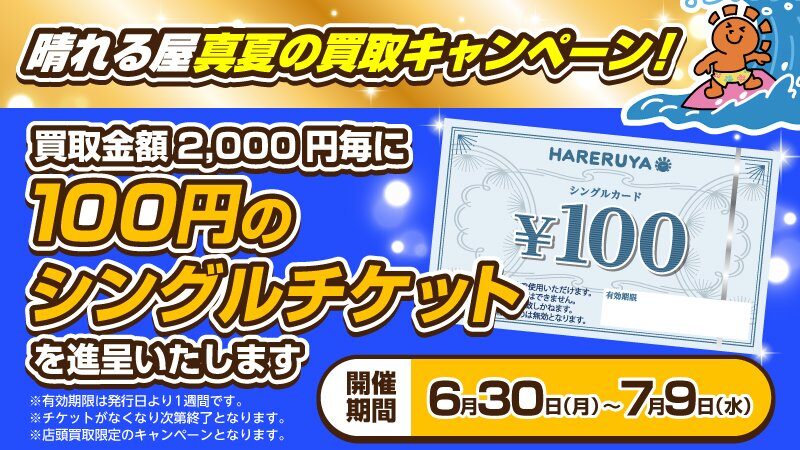 【キャンペーン】 『晴れる屋真夏の買取キャンペーン』開催中‼️🏝️ 📅期間:6/30(月)~7/9(水) 買取額2,000円毎に100円のシングルチケットを進呈します🎁 売れば売るほどお得に買えますよ🎵 ぜひこの機会にカードをお持ち込みください💪✨ MTGの売買なら ✅アティ郡山8階『晴れる屋 郡山店』 まで‼️