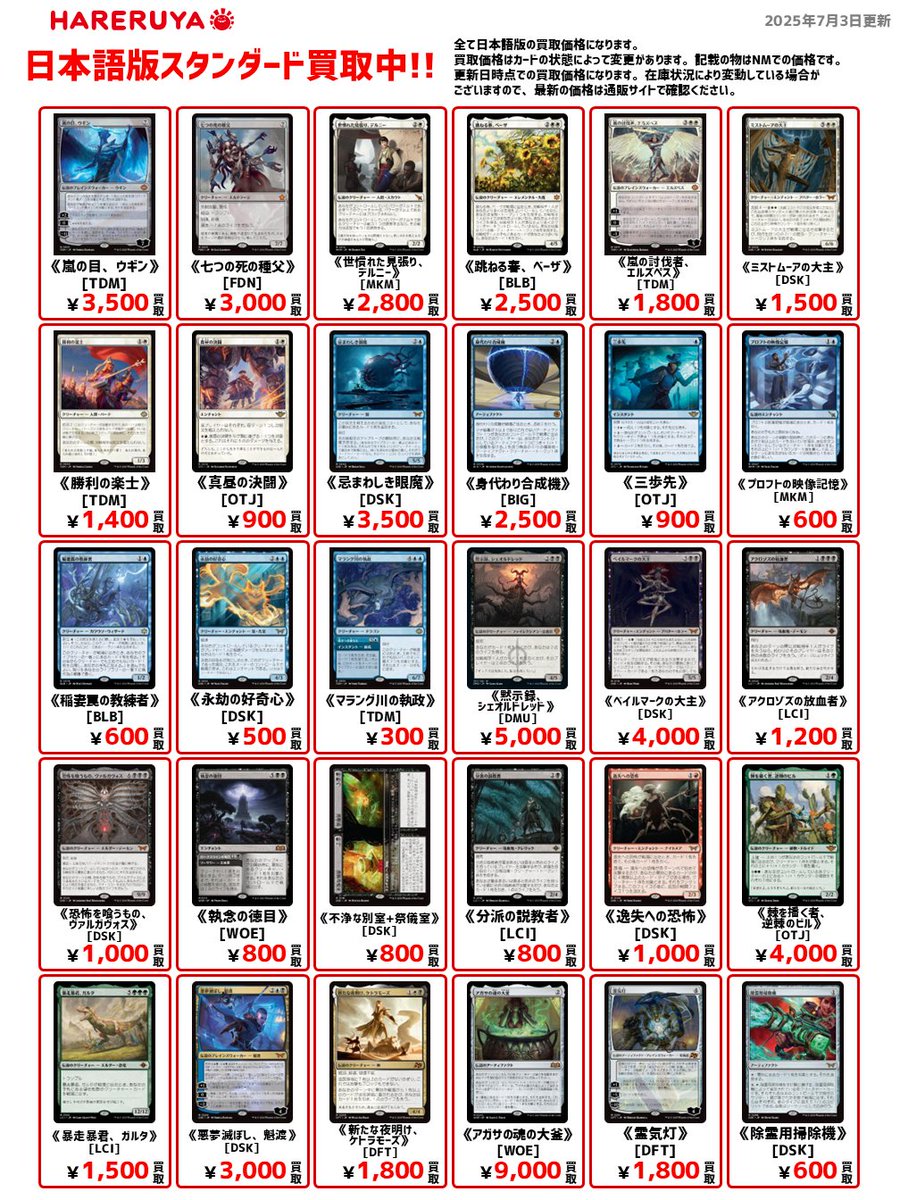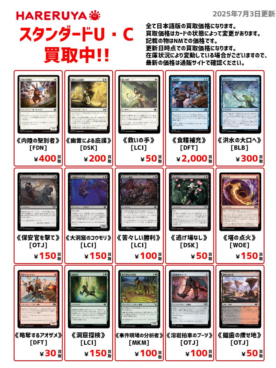 【買取情報】 🍴スタンダードUC・C買取募集🍴 日本語版参考価格はこちら🔽 《食糧補充》[DFT] ¥2,000🆙 《内陸の聖別者》[FDN] ¥400🆙 《保安官を撃て》[OTJ] ¥150🆙 《大洞窟のコウモリ》[LCI] ¥150🆙 『晴れる屋真夏の買取キャンペーン』開催中🏝️ ご来店お待ちしております🙇♀️