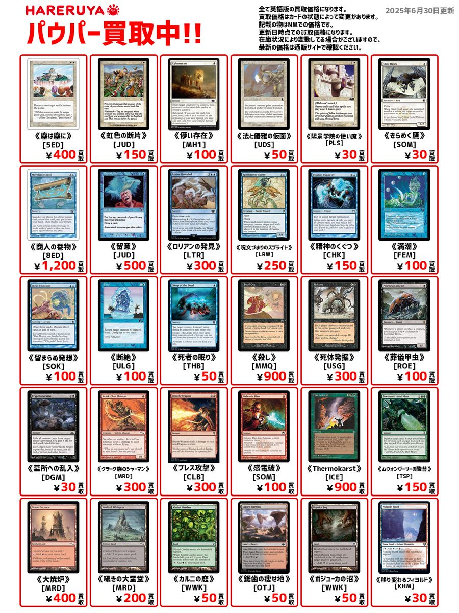 【買取情報】 現在パウパーの買取中‼️ 英語版の参考価格はコチラ🔽 《商人の巻物》[8ED] 1,200円買取 《殺し》[MMQ] 900円買取 《留意》[JUD] 500円買取 《死体発掘》[USG] 300円買取 《囁きの大霊堂》[MRD] 200円買取 1枚からでもお気軽にお持ち込みください😆