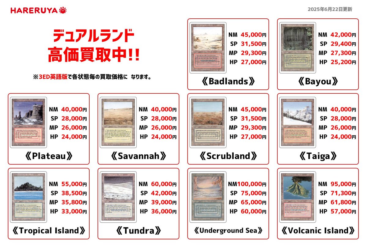 【買取情報】 🏝デュアルランド 買取中🏝 💧💀《Underground Sea》100,000円買取 💧🔥《Volcanic Island》95,000円買取 💧🌞《Tundra》60,000円買取 🔥💀《Badlands》45,000円買取 専門のスタッフが1枚1枚丁寧に査定します🔍 各店舗&ネットでも同額で買取中です🙆