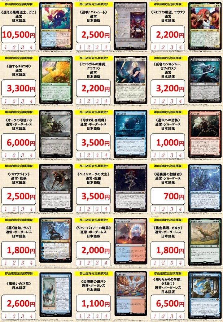 【買取情報】 晴れる屋郡山店限定🔥 緊急買取募集中です‼️ 《威名のソルジャー、セフィロス》¥3,200 《旅するチョコボ》¥3,300 《召喚:バハムート》¥2,500 《ミッドガルの傭兵、クラウド》¥2,200 などなど 【マジック:ザ・ギャザリング——FINAL FANTASY】 皆様のお持ち込みお待ちしています🙇♂️