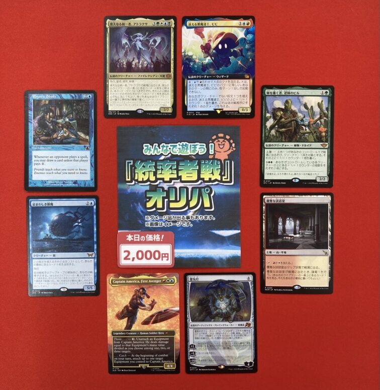 【#晴れ郡商品情報】 ⚔️『統率者戦オリパ』2,000円Ver.⚔️ 🎯注目のカード🎯 《リスティックの研究》EN 《Captain America, First Avenger》 《棘を播く者、逆棘のビル》など 統率者戦で活躍間違いなしのカード達です✨ 皆さまのご来店お待ちしております😆 ※画像は一例です。